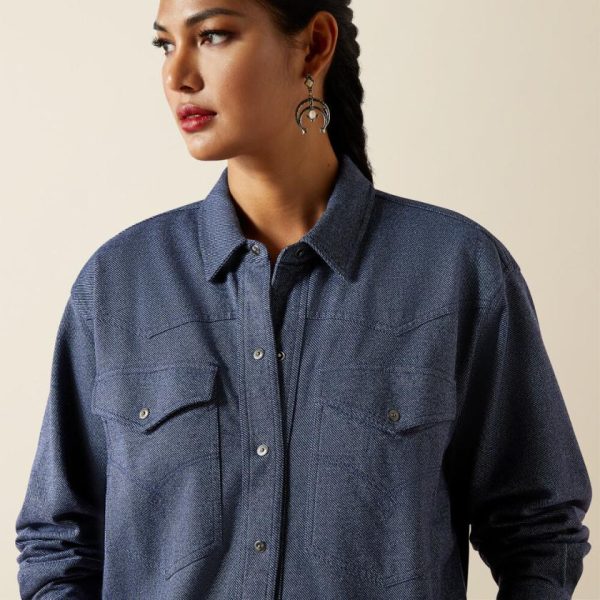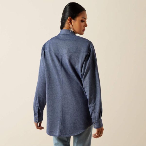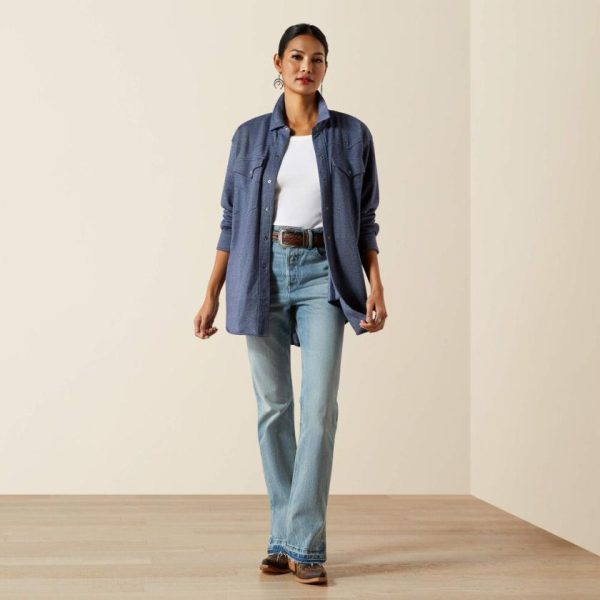 The styling possibilities are endless with this jersey-knit overshirt. Wear it solo, layer it over a tee, or cinch it with a belt to create an easy dress. Taking cues from the cowboys, it comes in a denim-inspired hue and has a Western yoke and large flap pockets.